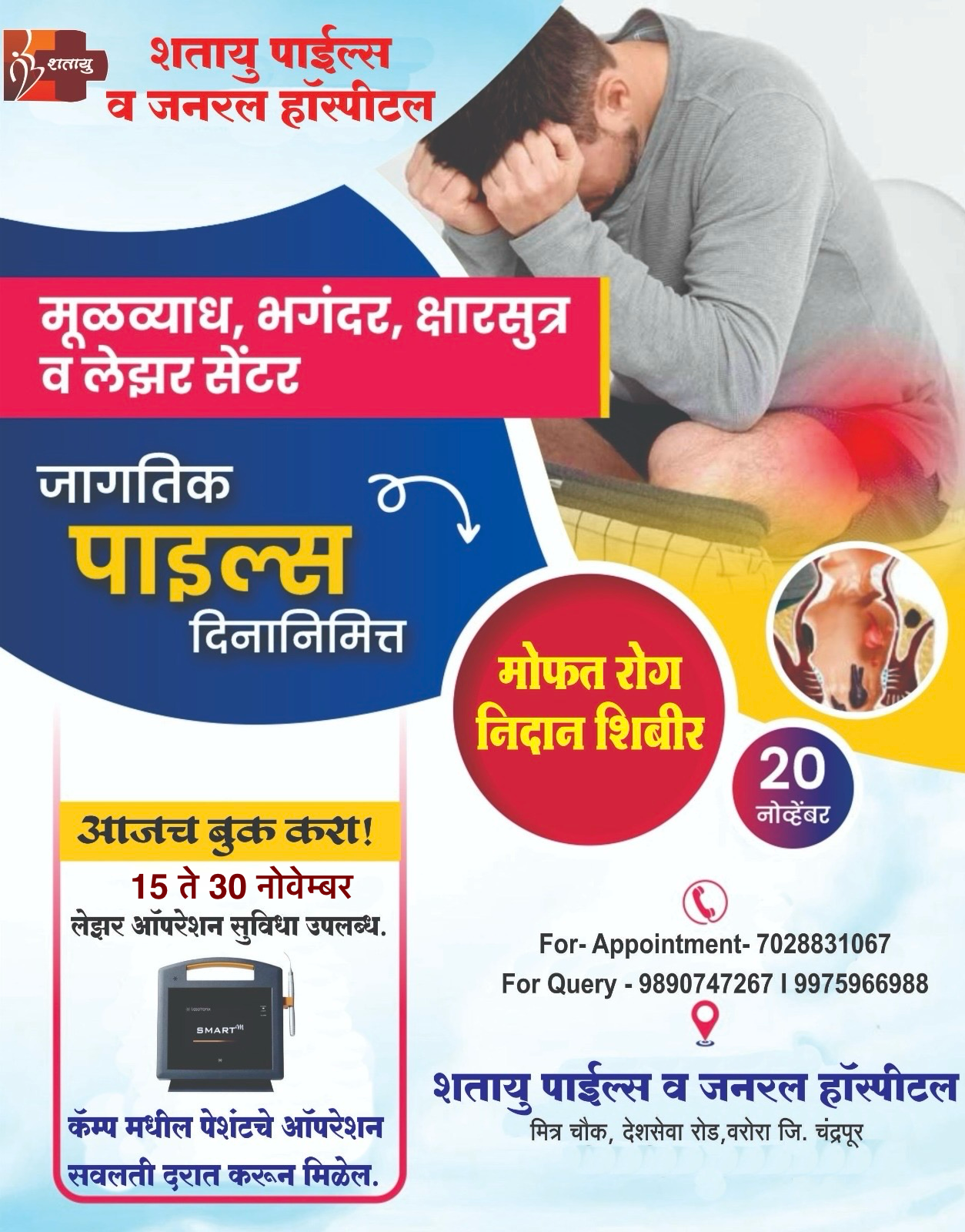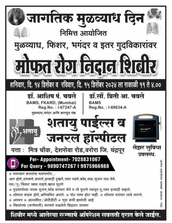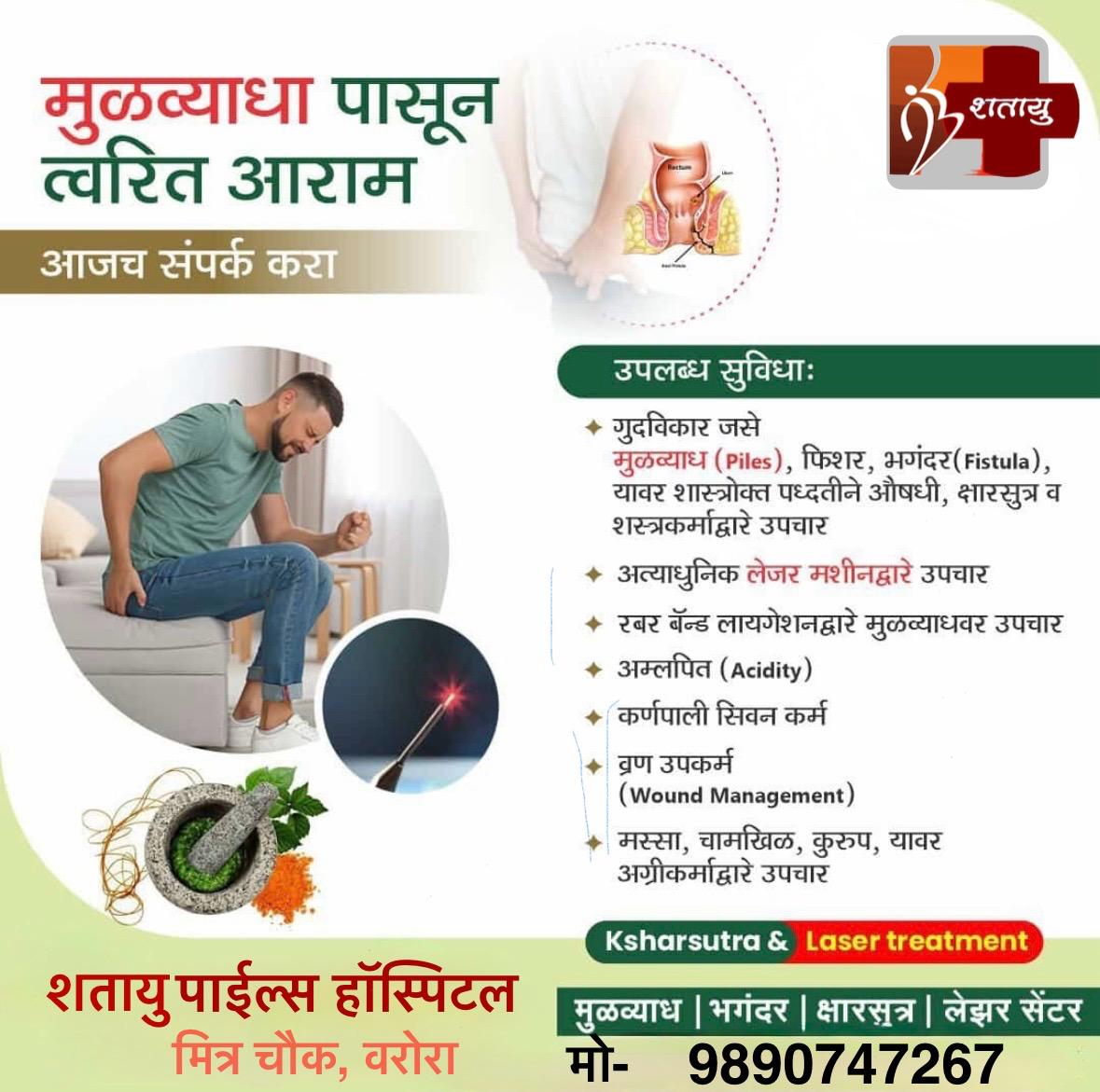 They are finest doctors in there categories. Hospital serves humanity from More than 10 years . They offering excellent treatment and better patient care .Hospital Located in heart of city in main market . They having latest LASER MACHINE with They offers PILES painless operation , An Ancient Ayurvedic KSHARSUTRA Treatment and laser PAIN management ( 1ST time in Chandrapur district ) and all these treatments in lowest cost .Gyanic and pediatric opd treatment better counselling by doctors . Ayurvedic consultation on conic diseases . Treatment for Piles , Fissure , Fistula , pain management , pediatric , Suvarnprashan, Gynac.